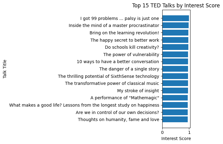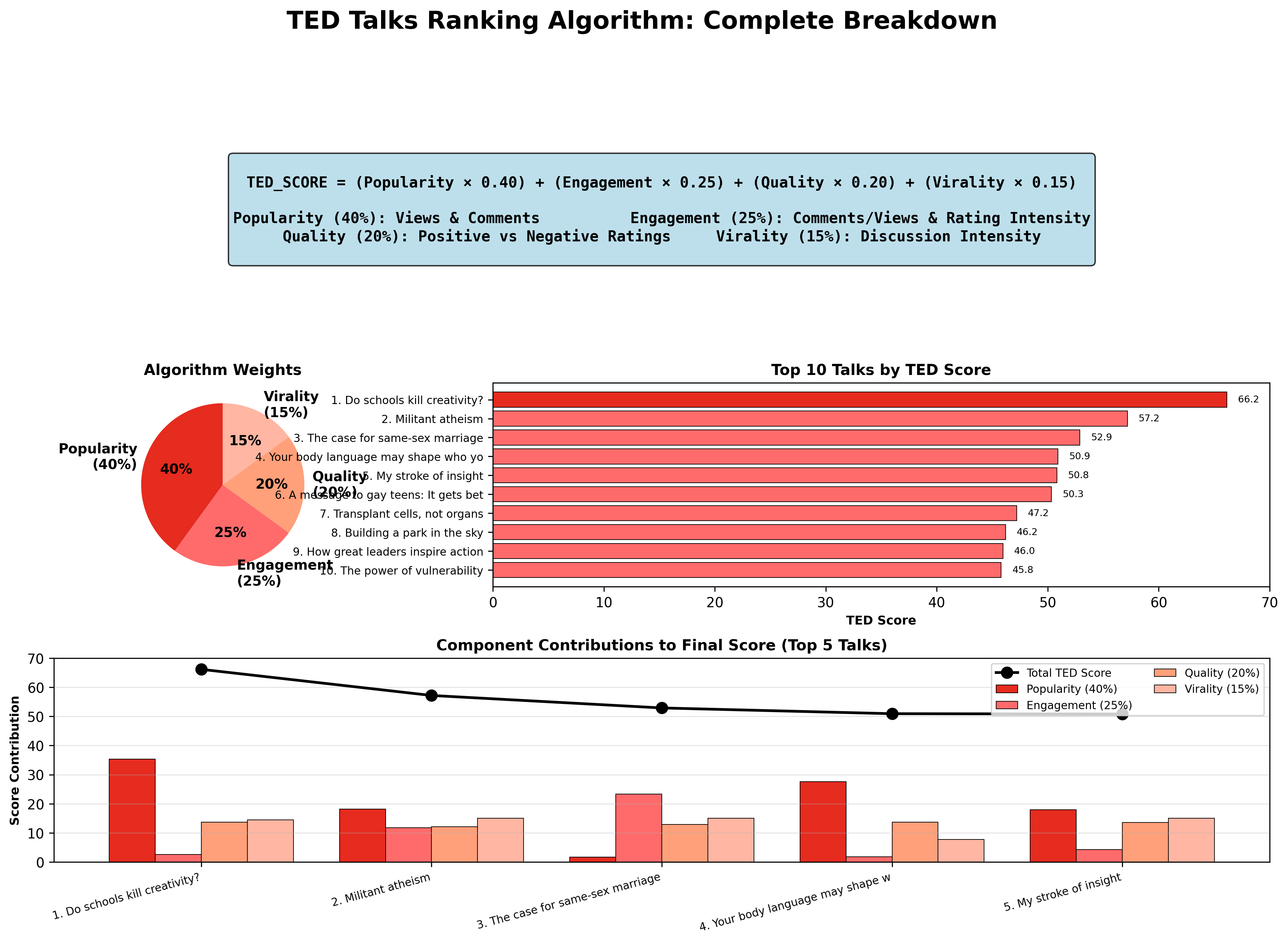 Then it went further. A complete algorithm breakdown: the formula, the weight pie chart, the top 10 with exact scores, and a component contribution chart for the top 5 showing exactly where each talk's score came from. This is the kind of output you'd put in a slide deck.