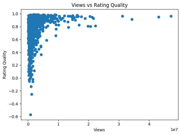 Two things stand out from the scatter: bad talks don't scale (high views almost always means high quality), but good talks don't always scale (low views, high variance in quality). Views are a lagging popularity signal. Ratings are the real quality signal.