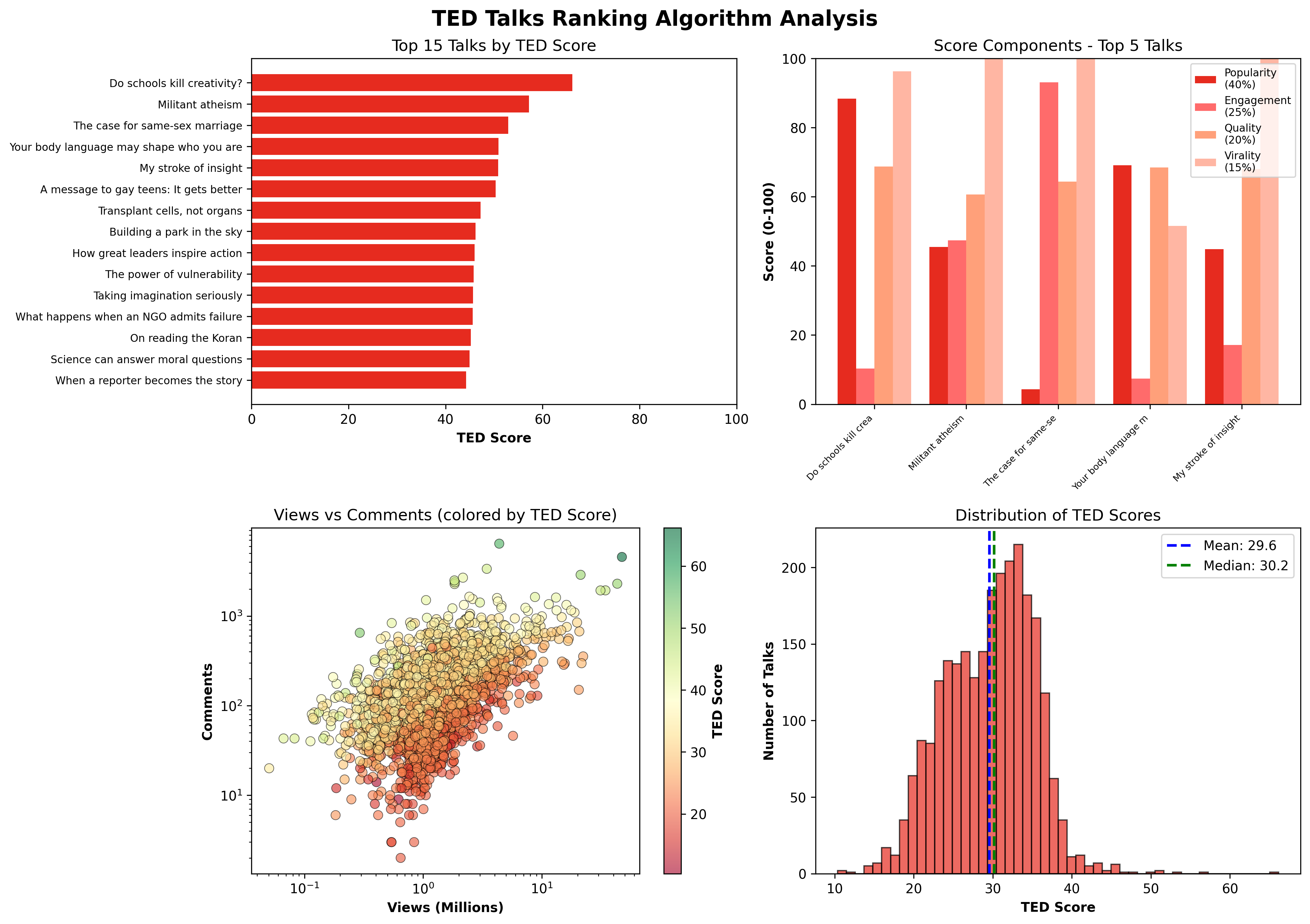 The ranking algorithm weighted views (30%), rating quality (25%), comments (15%), languages translated (10%), total ratings (10%), stage response rate (5%), and duration sweet spot (5%), all normalized within publish year to reduce age bias.