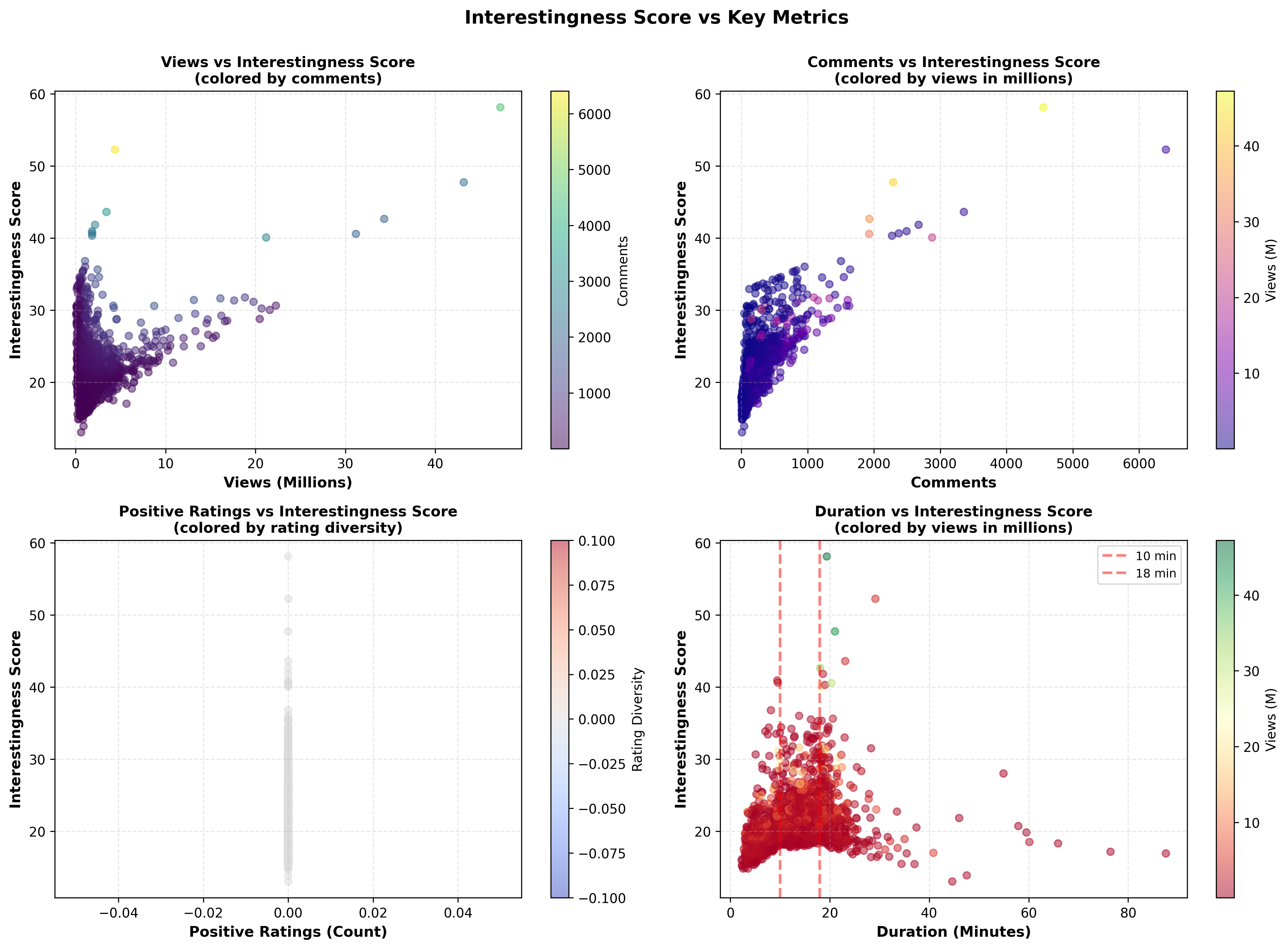 And a four-panel correlation analysis: interestingness vs. views (colored by comments), vs. comments (colored by views), vs. positive ratings (colored by rating diversity), and vs. duration (with the 10-18 minute sweet spot marked). Each panel tells a different story about what drives TED talk quality.